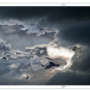 What do we see here? It is a moment in time of a timeless movement, namely the passing of the clouds, which is represented in the form of topographic maps that suggest you could go back there. By coloring the cards with colors that come from the photo, the photo is flattened and it loses the depth that was first brought back into it. We see here a reconstruction of nature; cloudscapes without clouds.